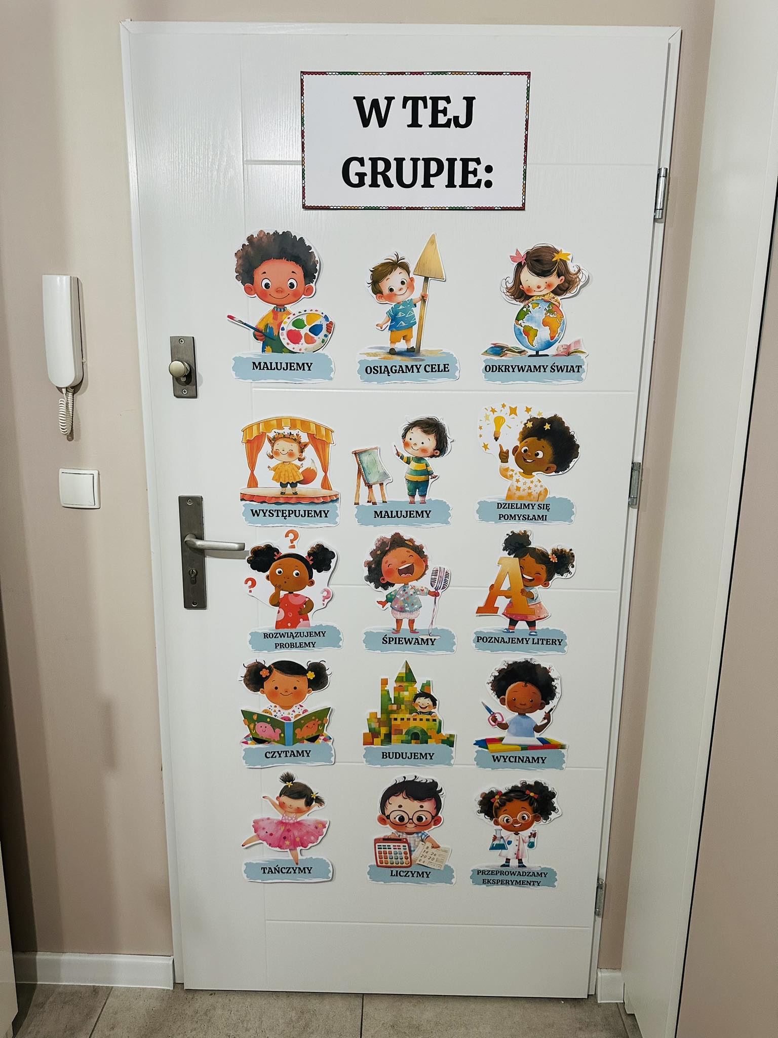 W tej sali/ grupie/ klasie / świetlicy- dekoracje na drzwi.