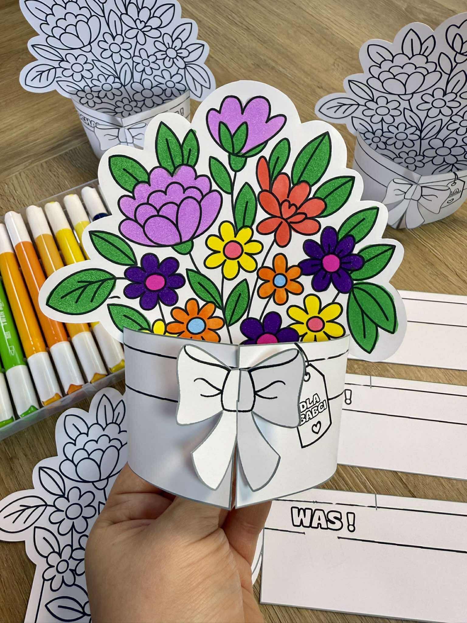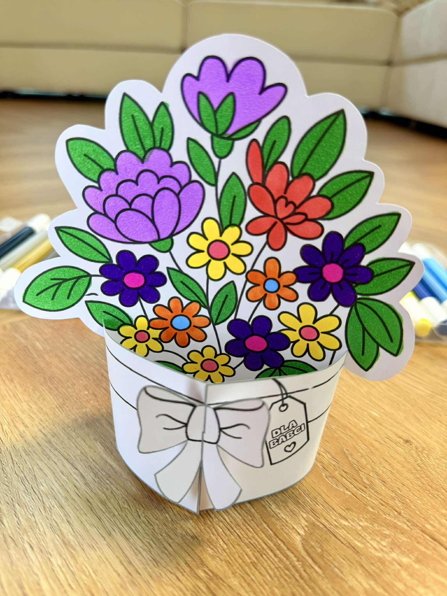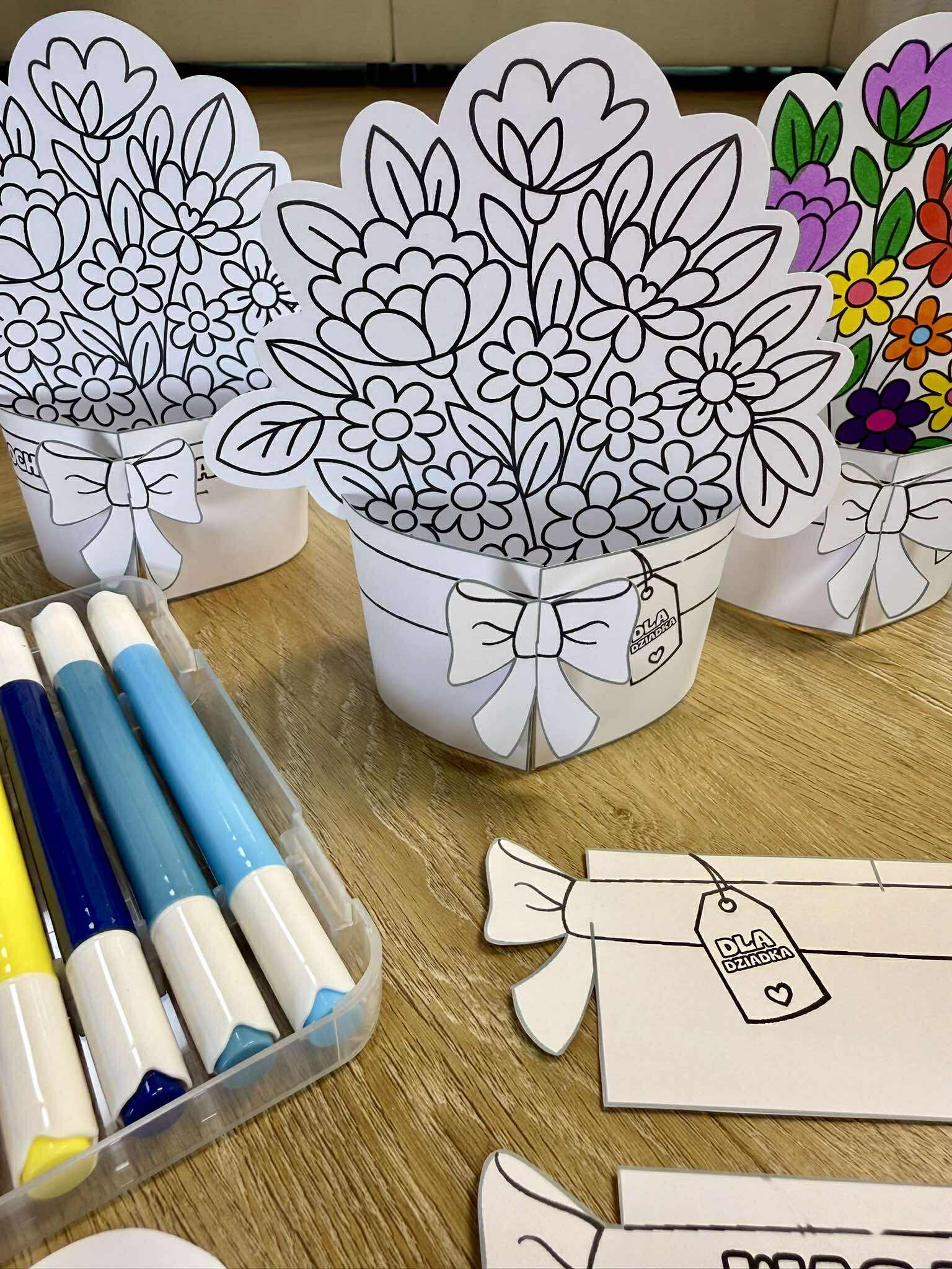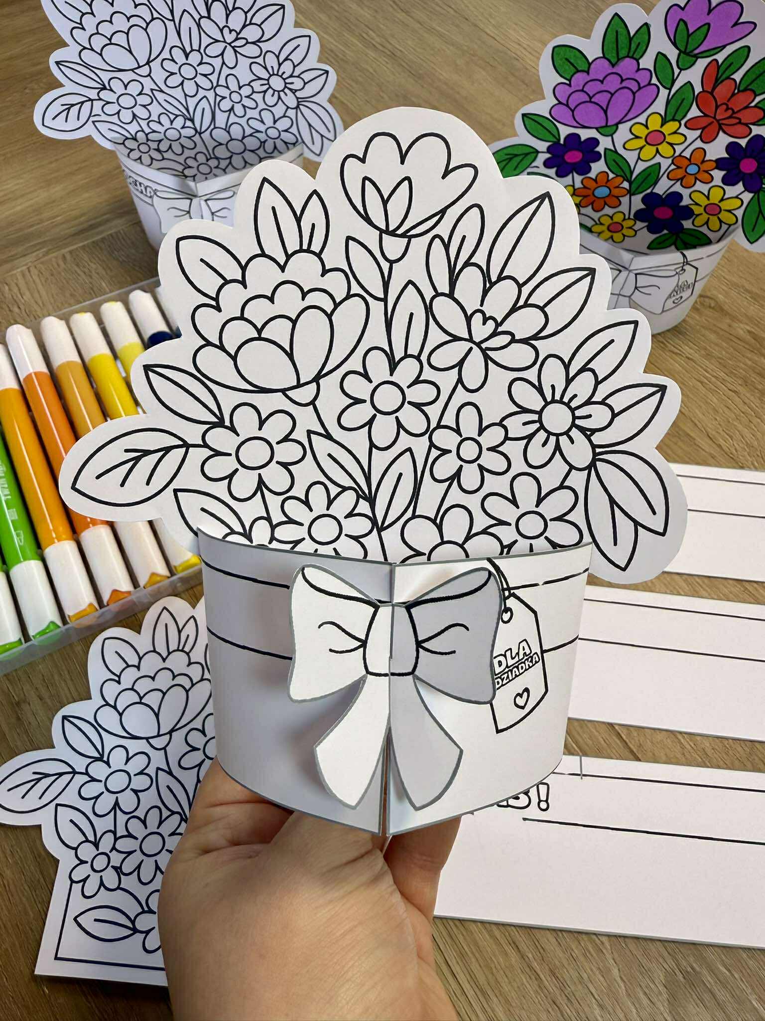 Dzień Babci i Dziadka- Stojące bukiety 3D do pokolorowania dla dzieci.