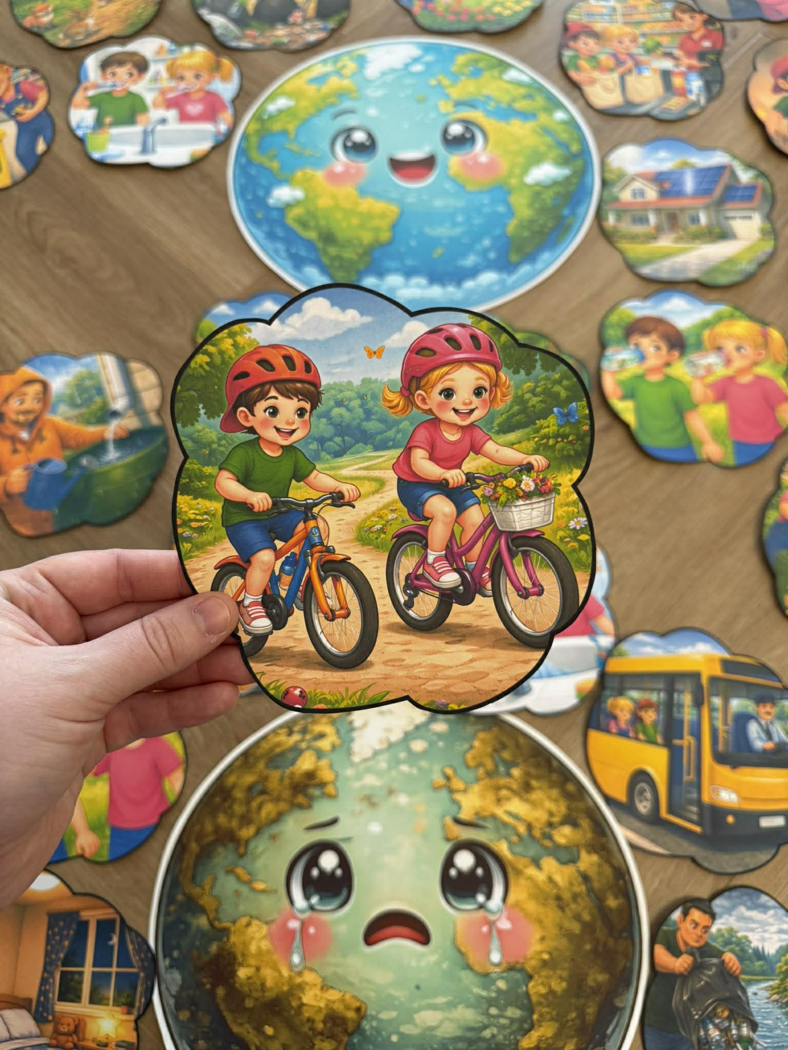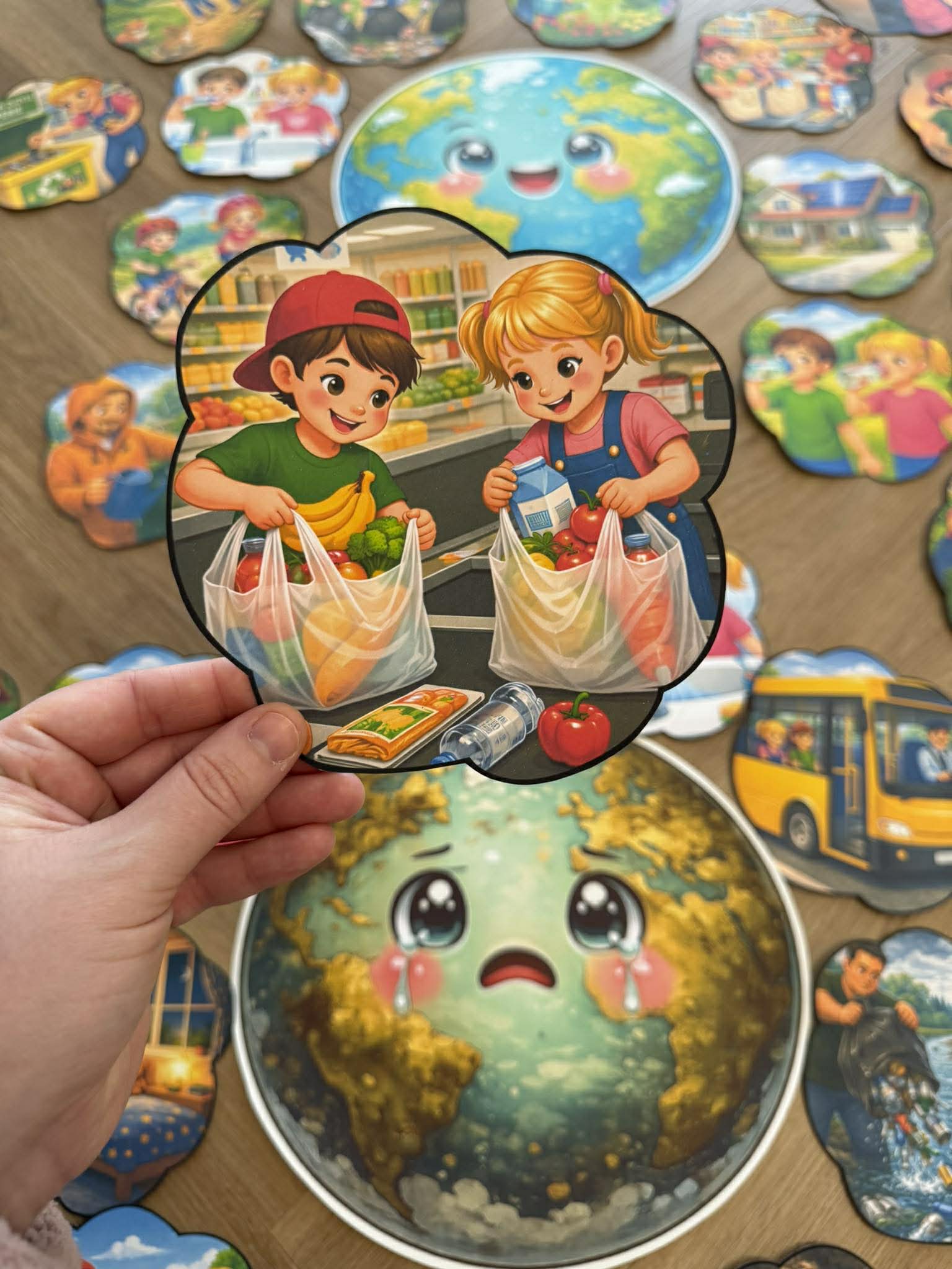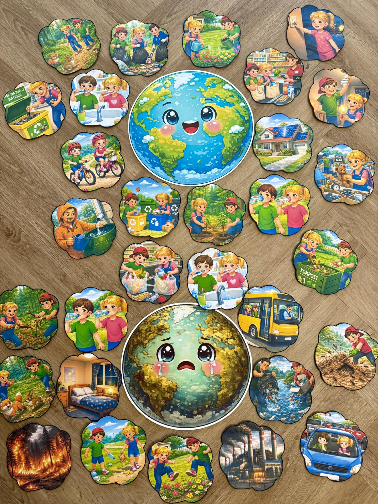W pliku znajdują się 34 plansze do podziału oraz ilustracje wesołej i smutnej Ziemi.