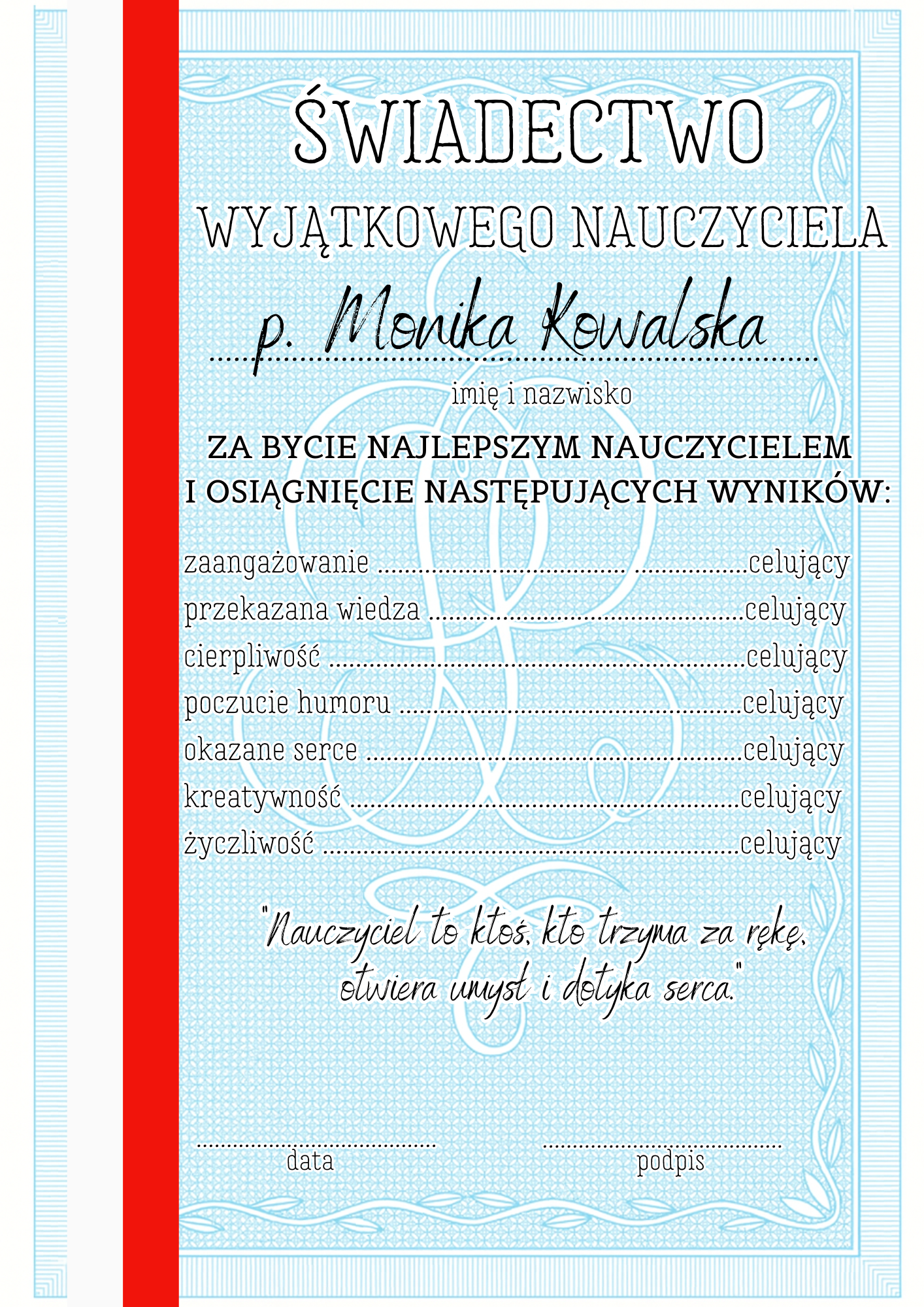 Dzień Edukacji - Świadectwo Dla Nauczyciela - z możliwością edycji