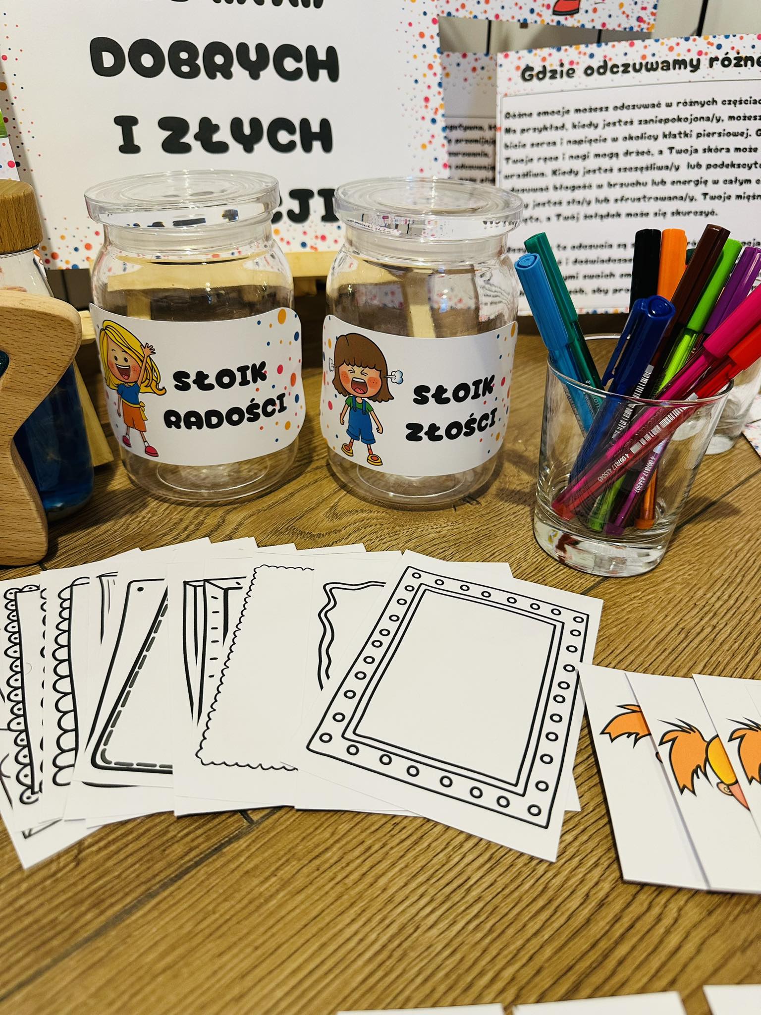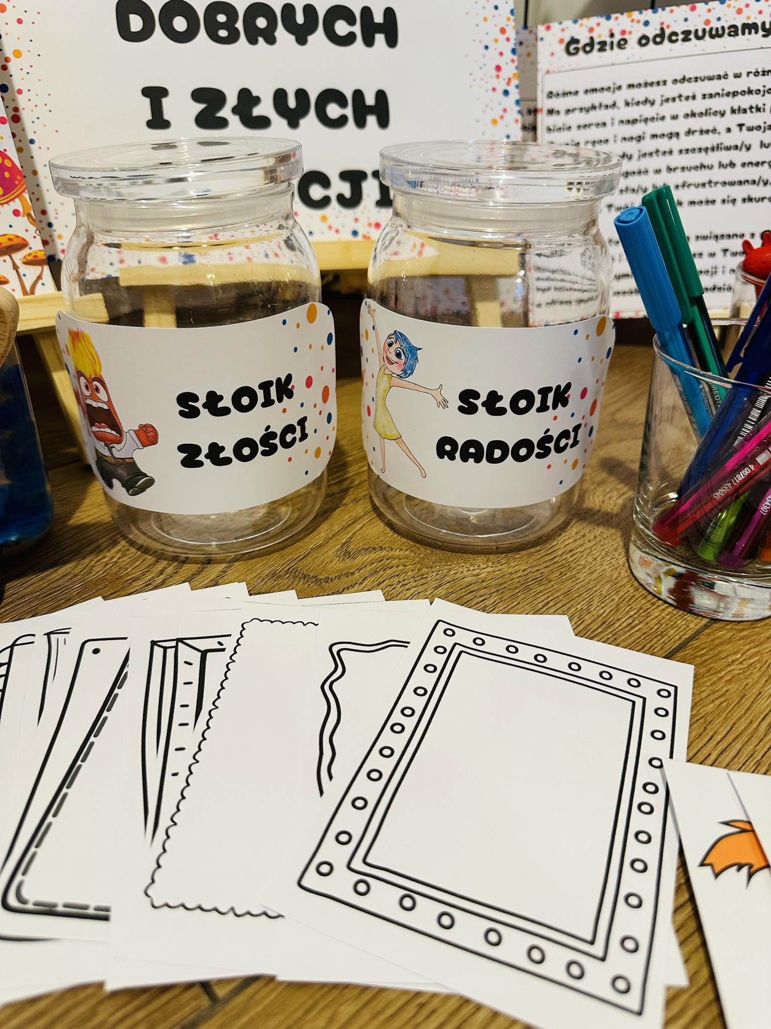 Słoiki złości/ słoik radości- dzieci wrzucają narysowane przez siebie emocje,