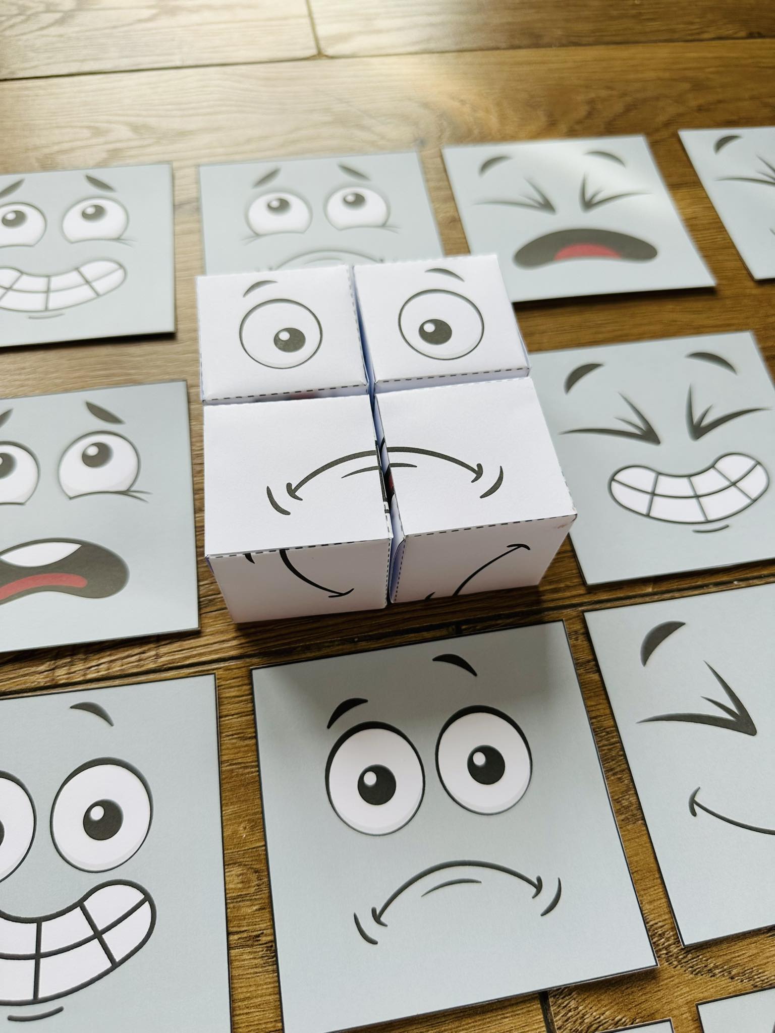 KOSTKA Emocje - zabawa polega na ułożeniu kostek według ilustracji.