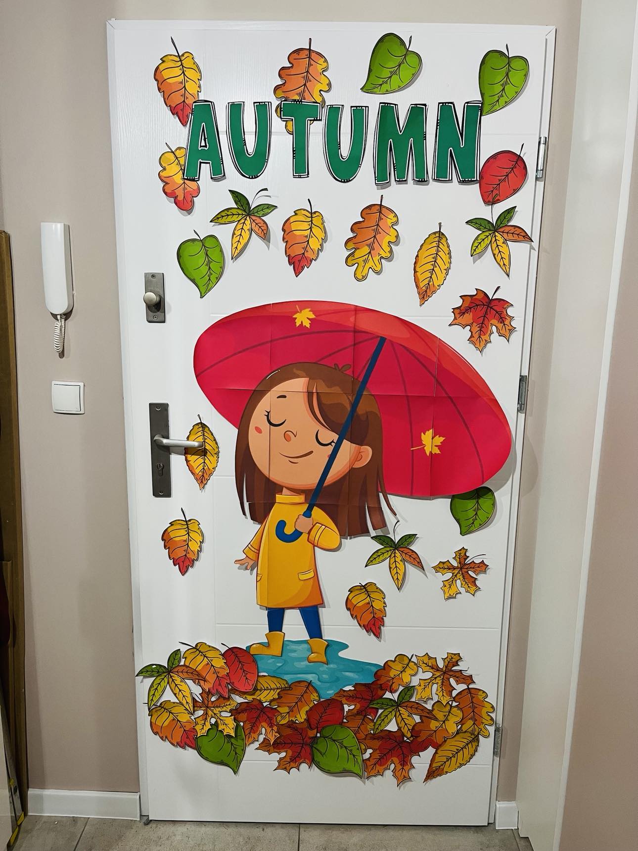 Jesień - Dziewczynka z parasolem- jesienna dekoracja na drzwi z napisem w języku polskim oraz angielskim.