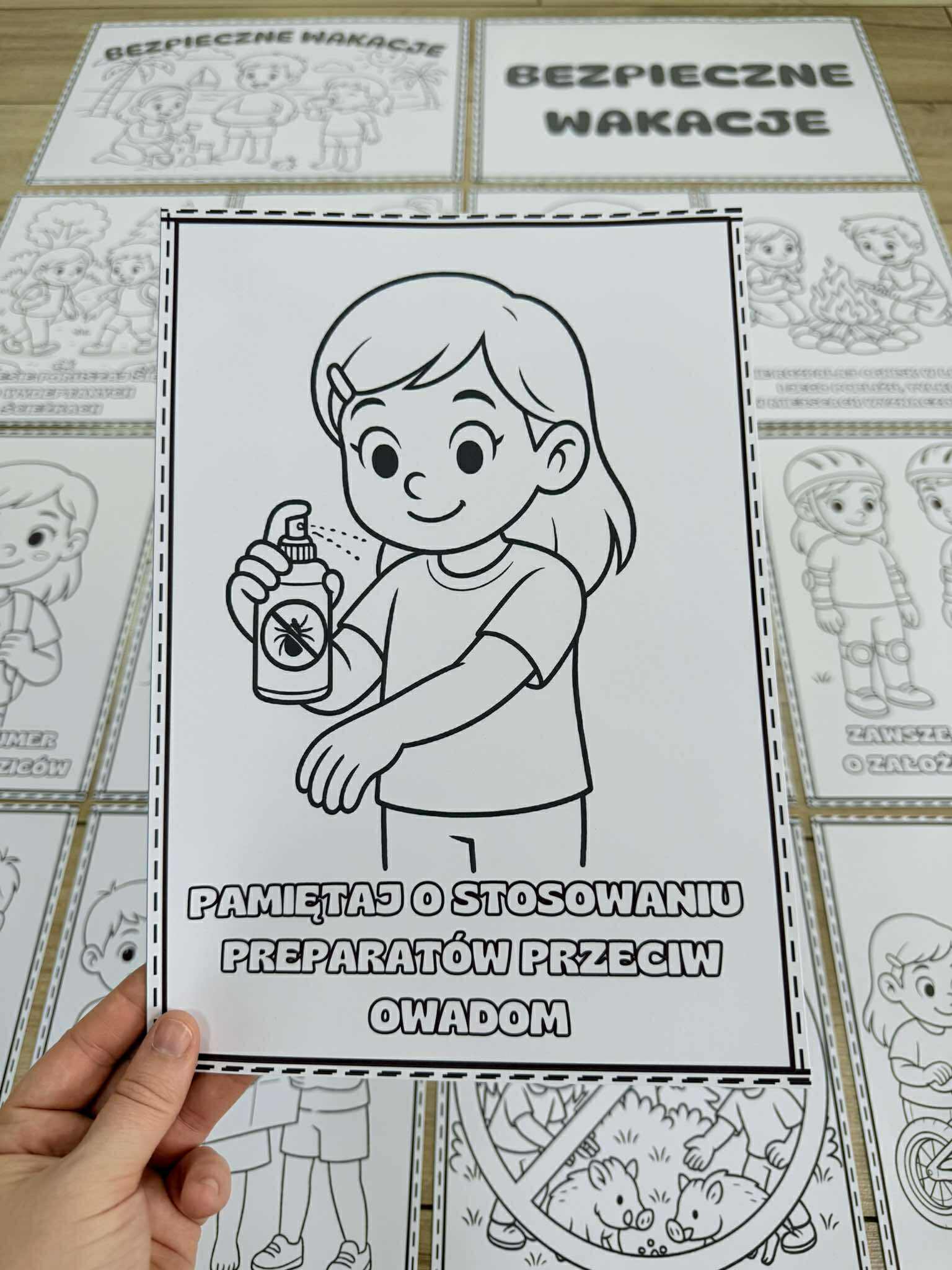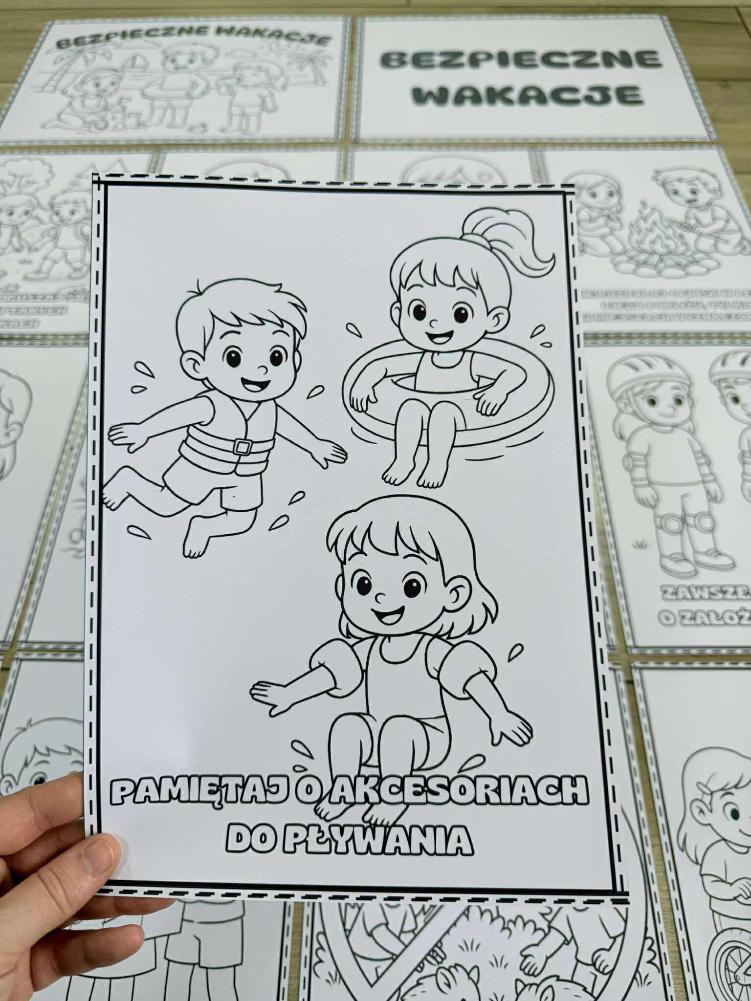 Lato - Bezpieczne Wakacje - Plansze z ilustracjami i napisami - wersja czarno-biała
