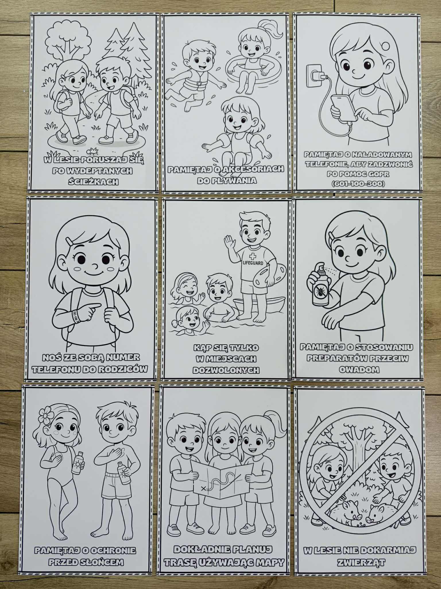 Lato - Bezpieczne Wakacje - Plansze z ilustracjami i napisami - wersja czarno-biała