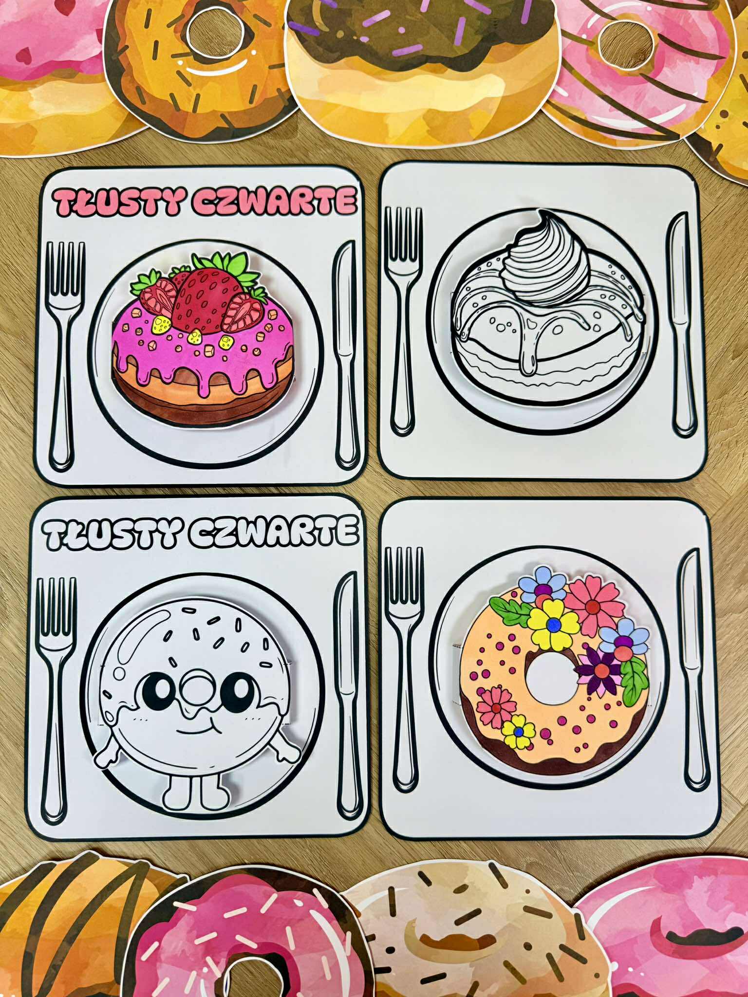 W pliku znajdują się różne ilustracje pączków oraz dwa wzory szablonów ( jeden z napisem