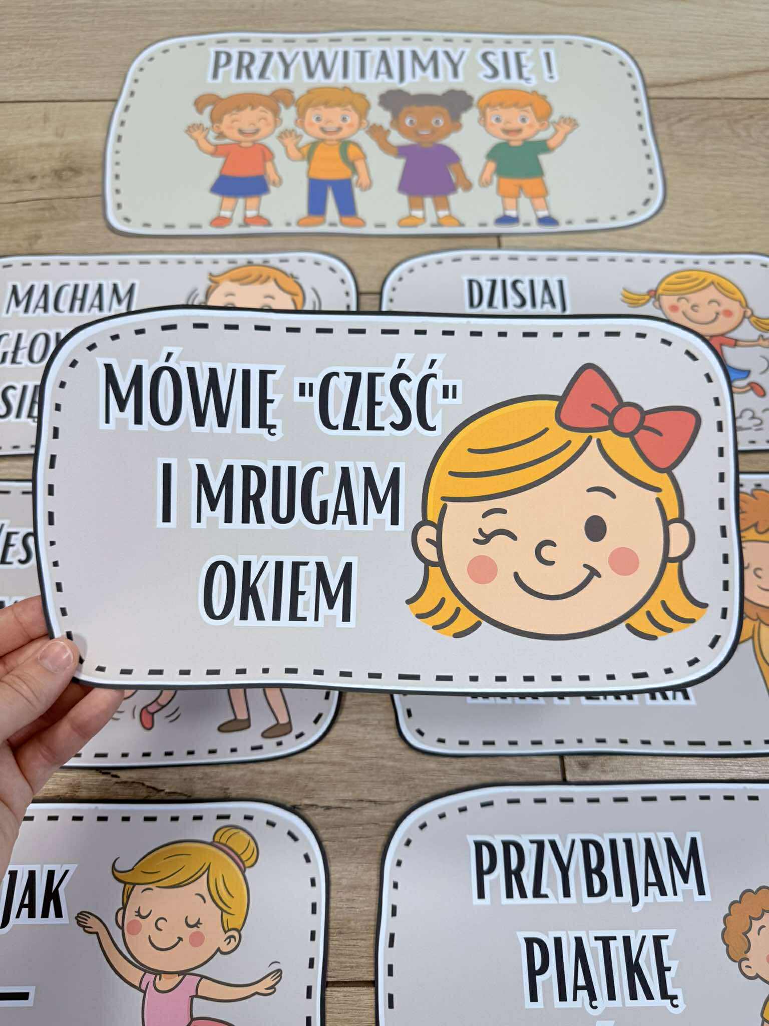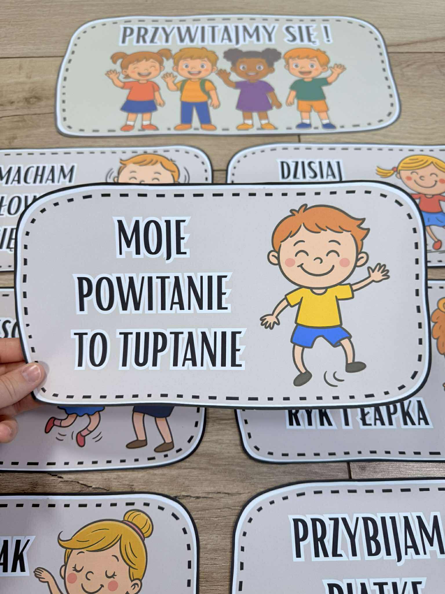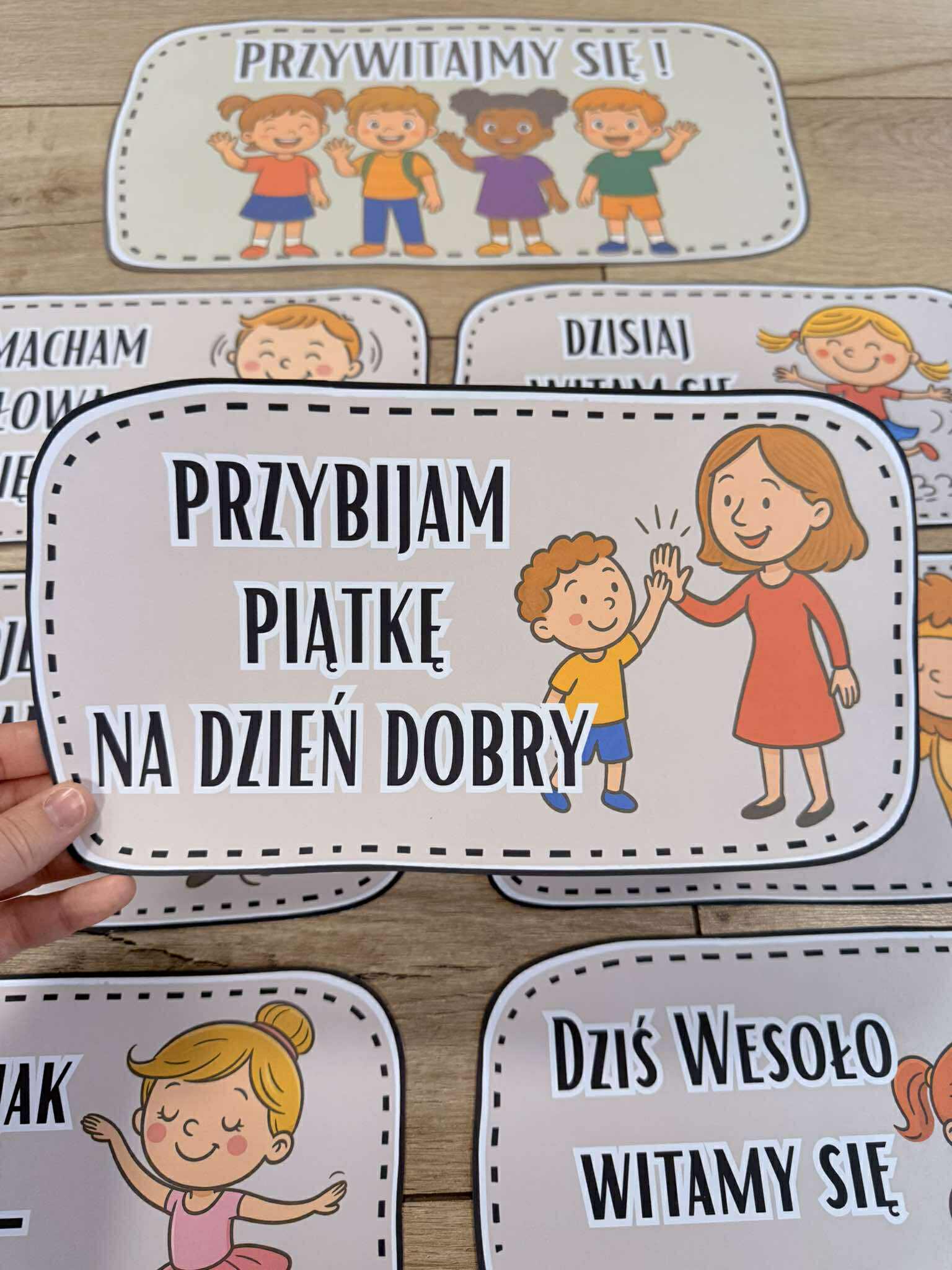 Przywitajmy się ! - Tabliczki z napisami i ilustracjami.