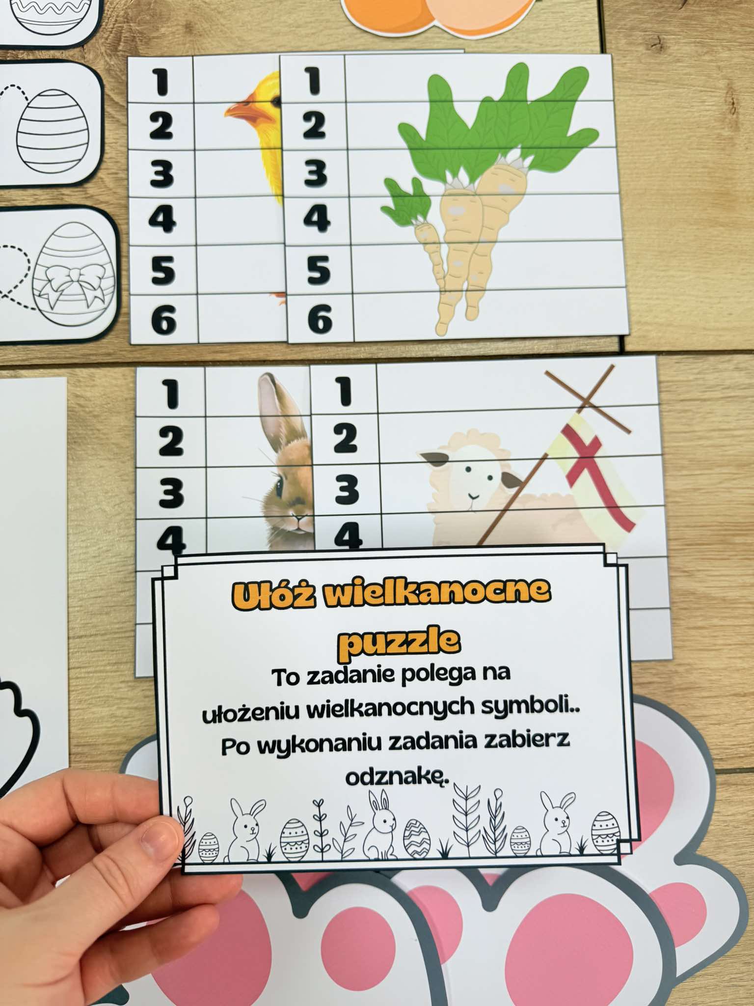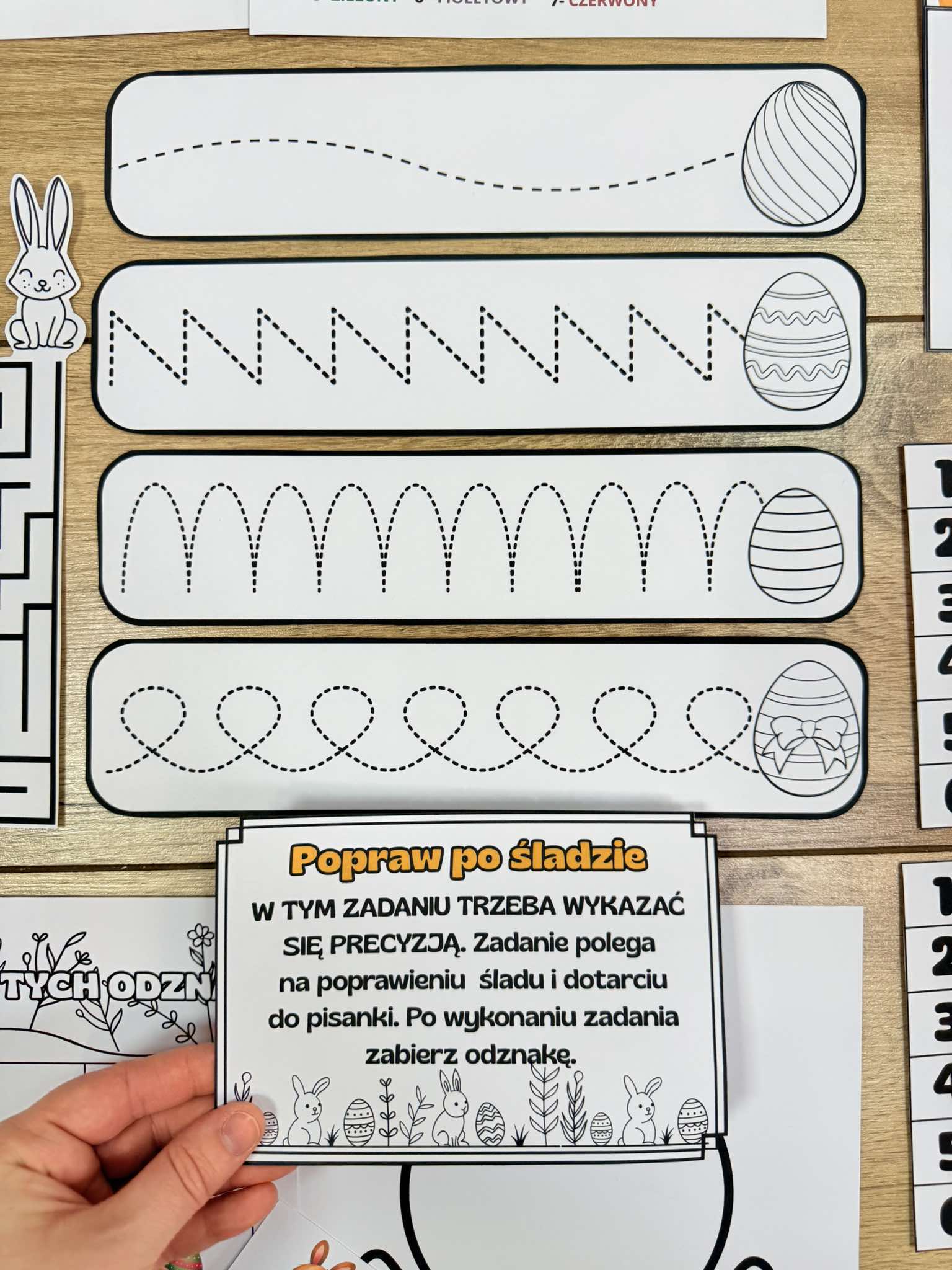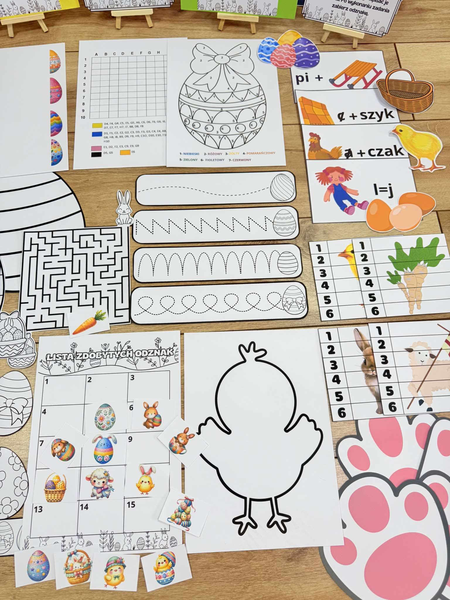 Dołączony jest również list do dzieci, list gratulacyjny, Plansza na przyklejanie odznak, opaska, ślady zająca i inne.