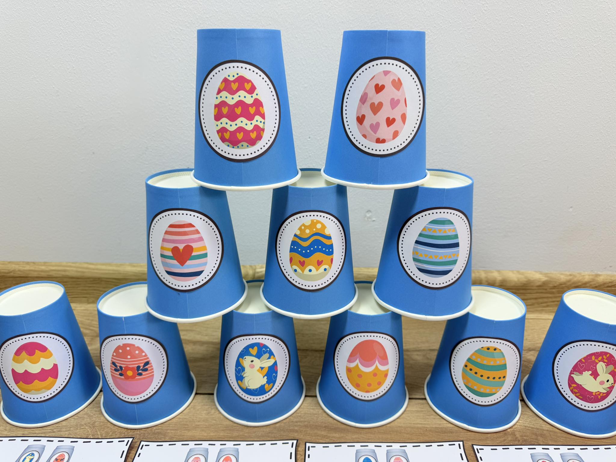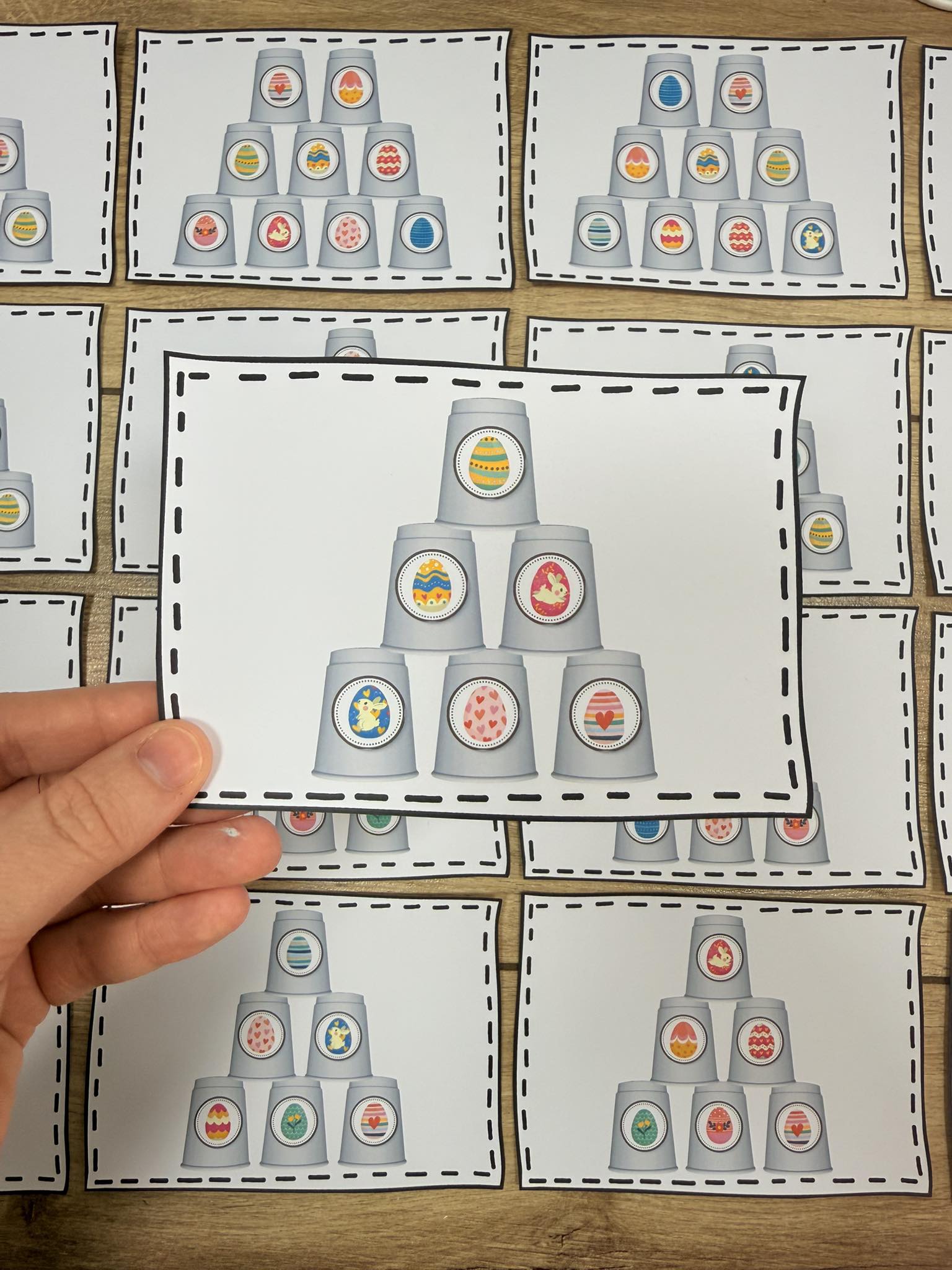 Zadaniem dzieci jest ułożenie kubeczków według ilustracji, a w pliku znajdują się różne stopnie trudności - 44 plansze.