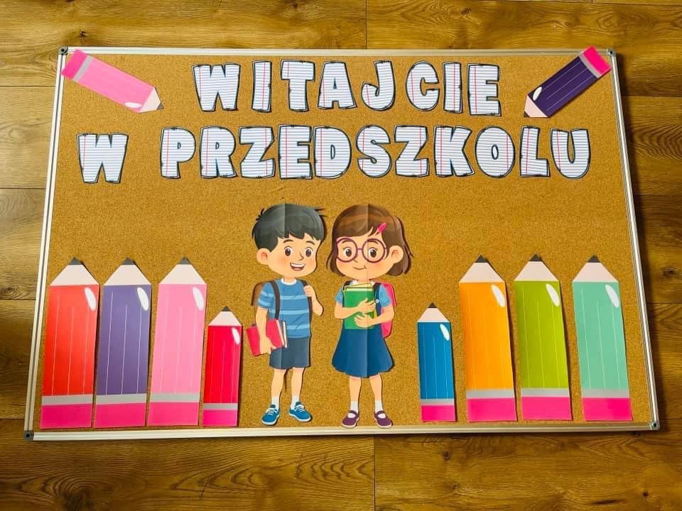 Dekoracje/ Gazetka na  powitanie dzieci z kredkami - Witajcie w Przedszkolu.