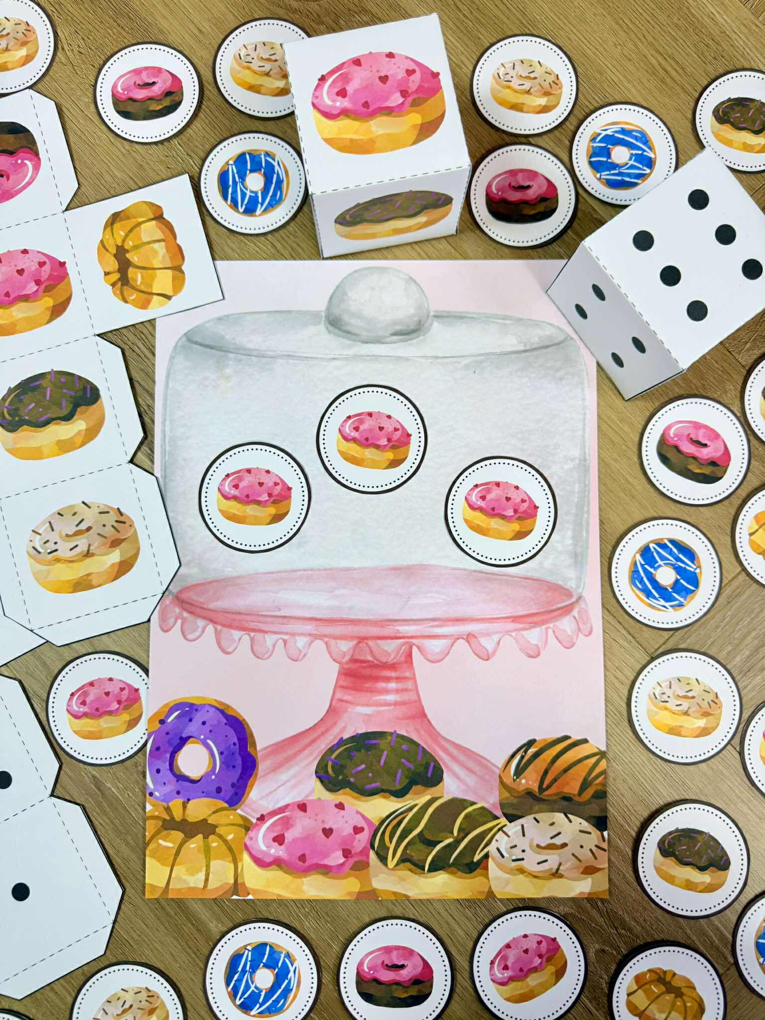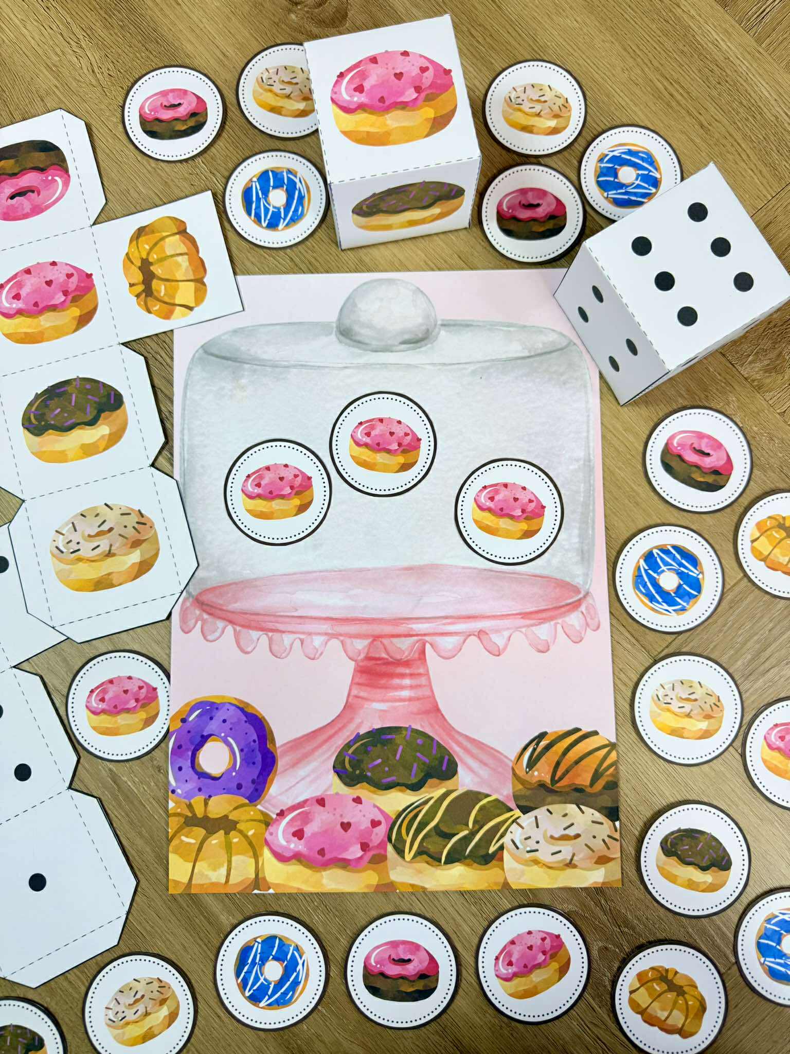 Dzieci rzucają kostkami, które wskazując na ilość pączków do umieszczenia na planszy, druga kostka wskazuje również konkretnego pączka.
