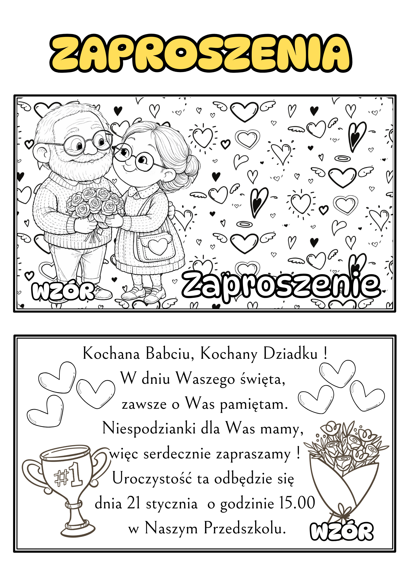 W pliku znajdują się różne wzory biało-czarne do wyboru oraz treść zaproszeń dla : dziadków, babci, dziadka.