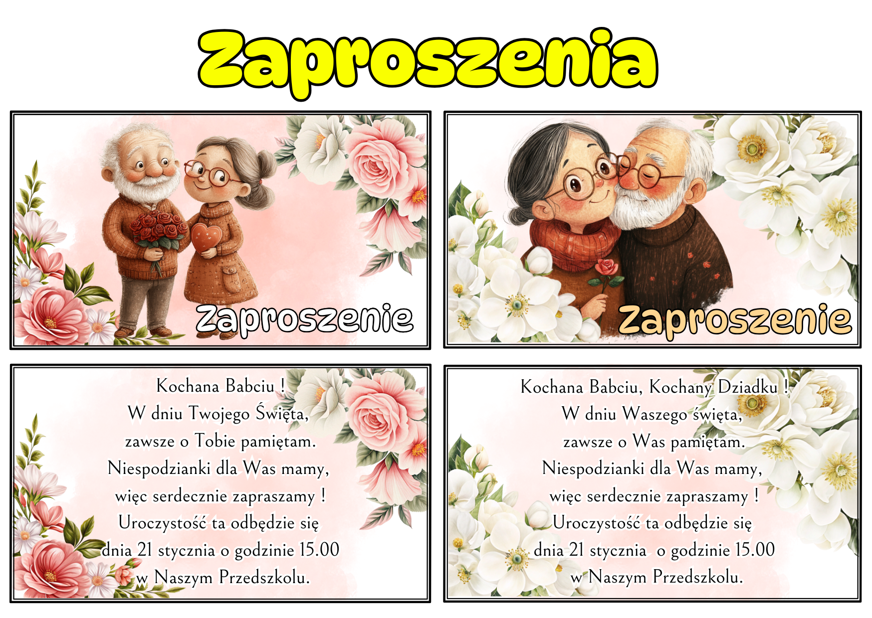 W pliku znajdują się różne wzory do wyboru oraz treść zaproszeń dla : dziadków, babci, dziadka.
