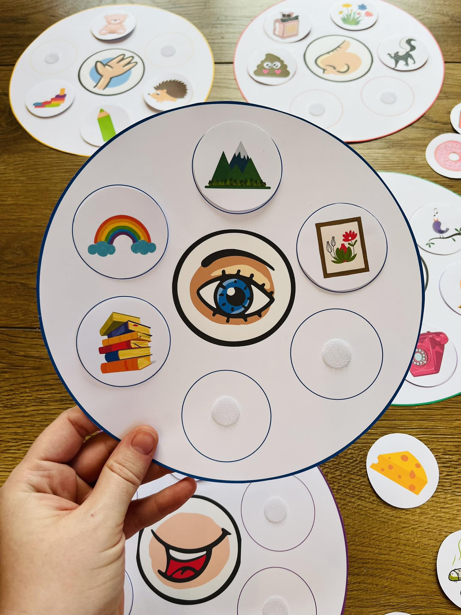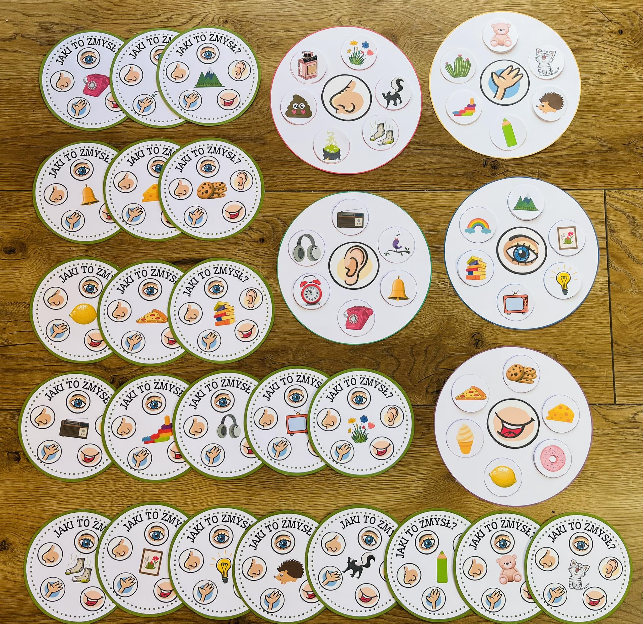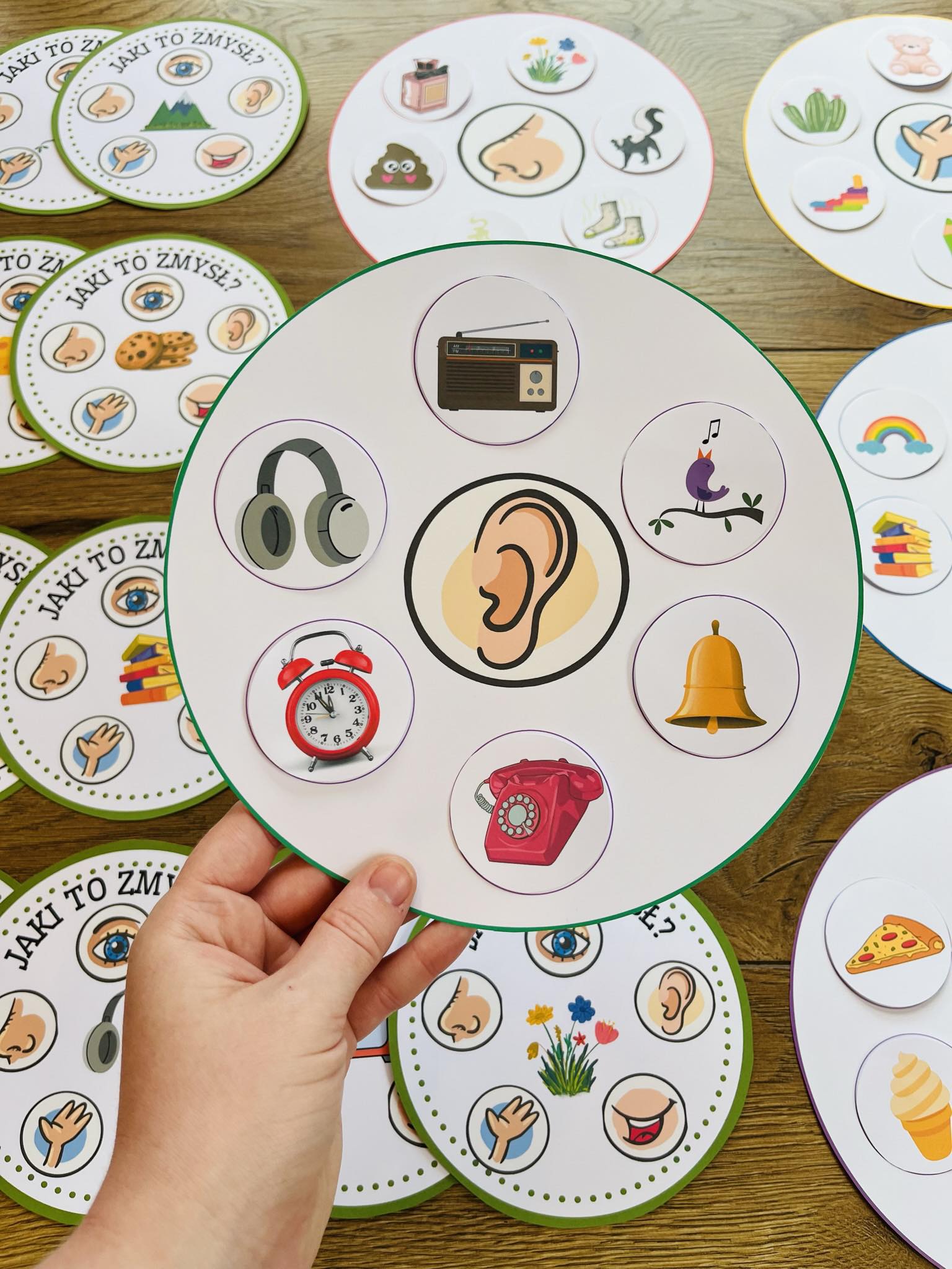 - dopasowanie elementów do odpowiedniego zmysłu - 5 dużych kółek ze zmysłami + małe kółeczka z elementami do dopasowania 21 szt.