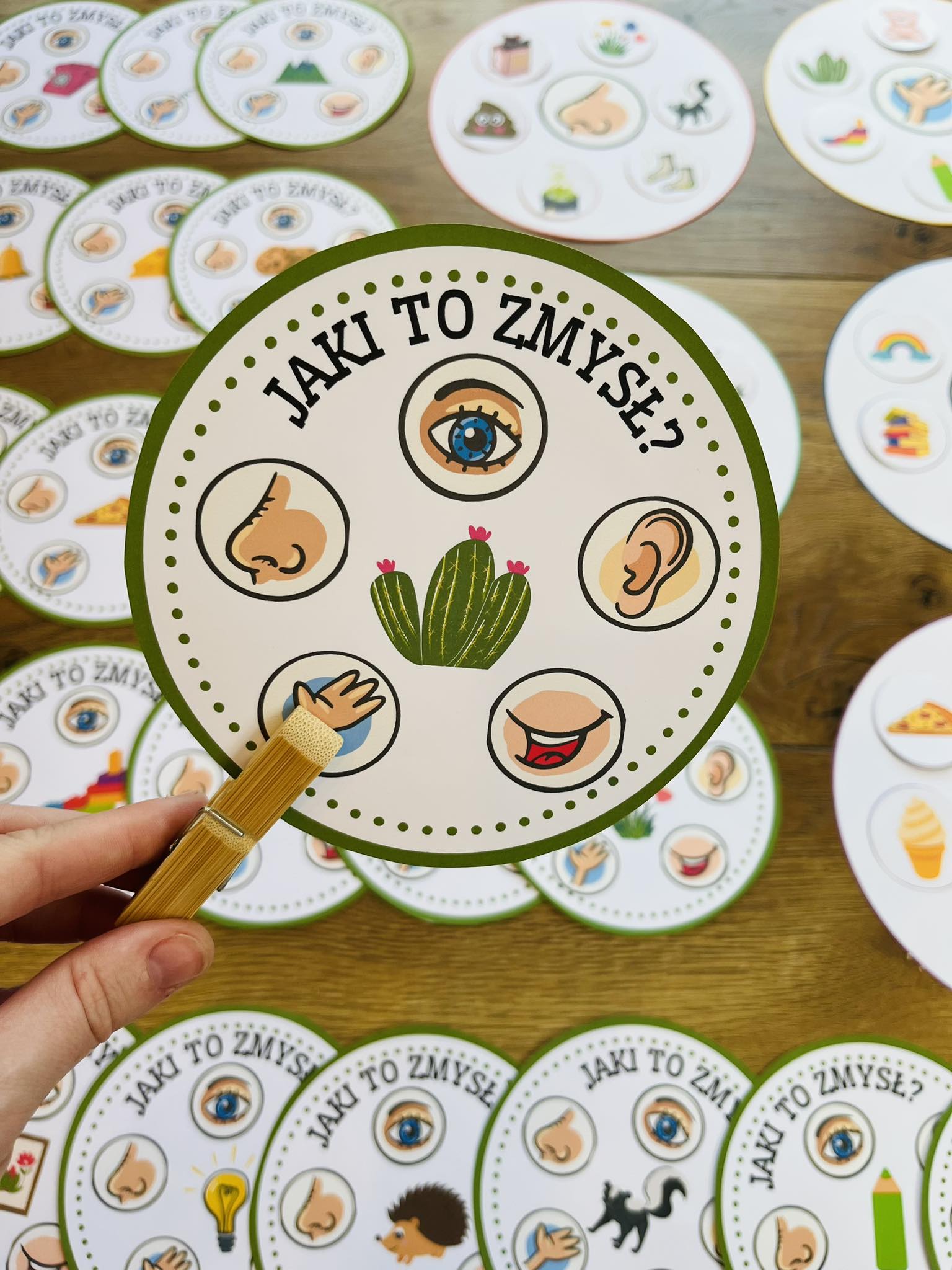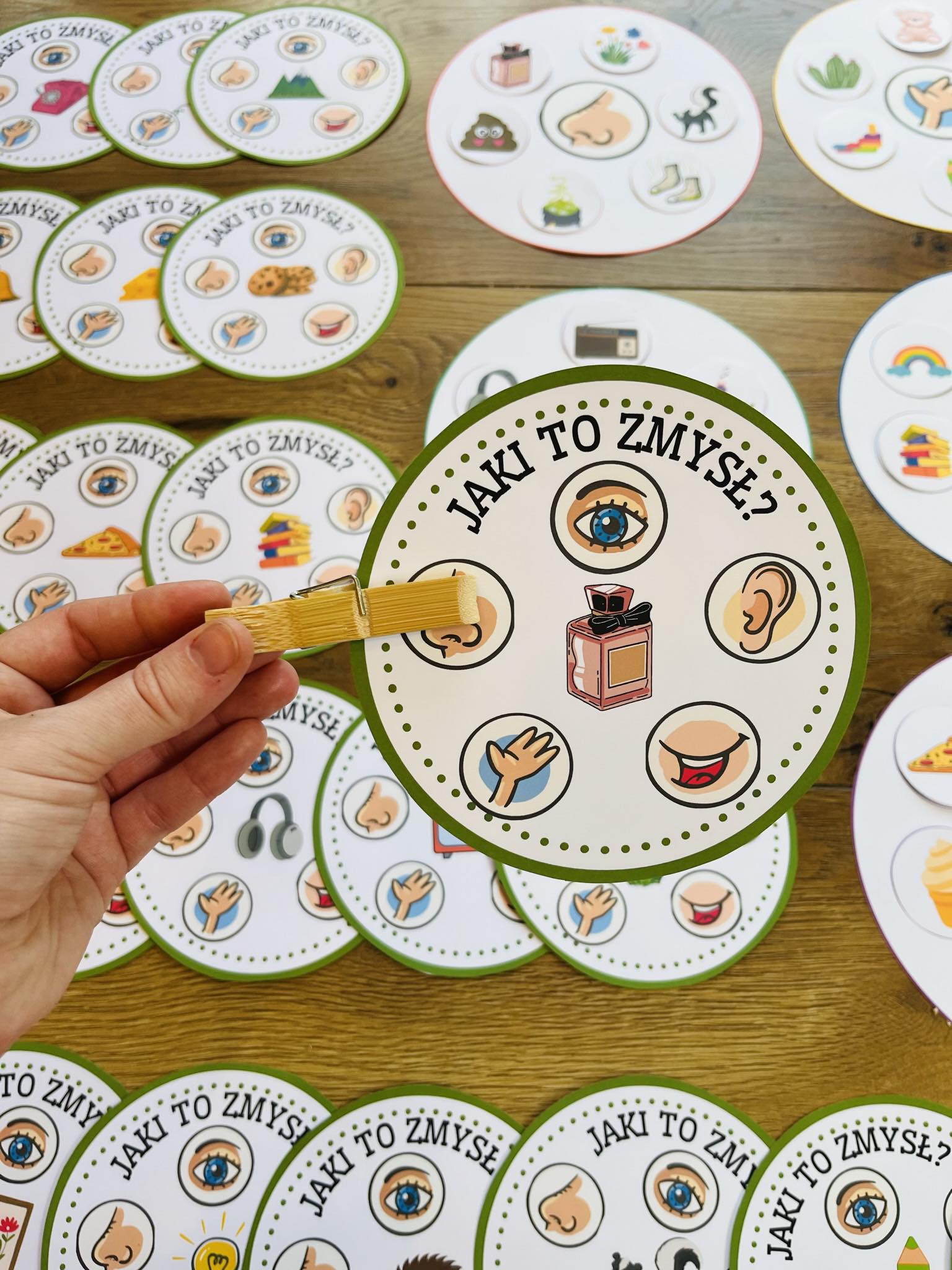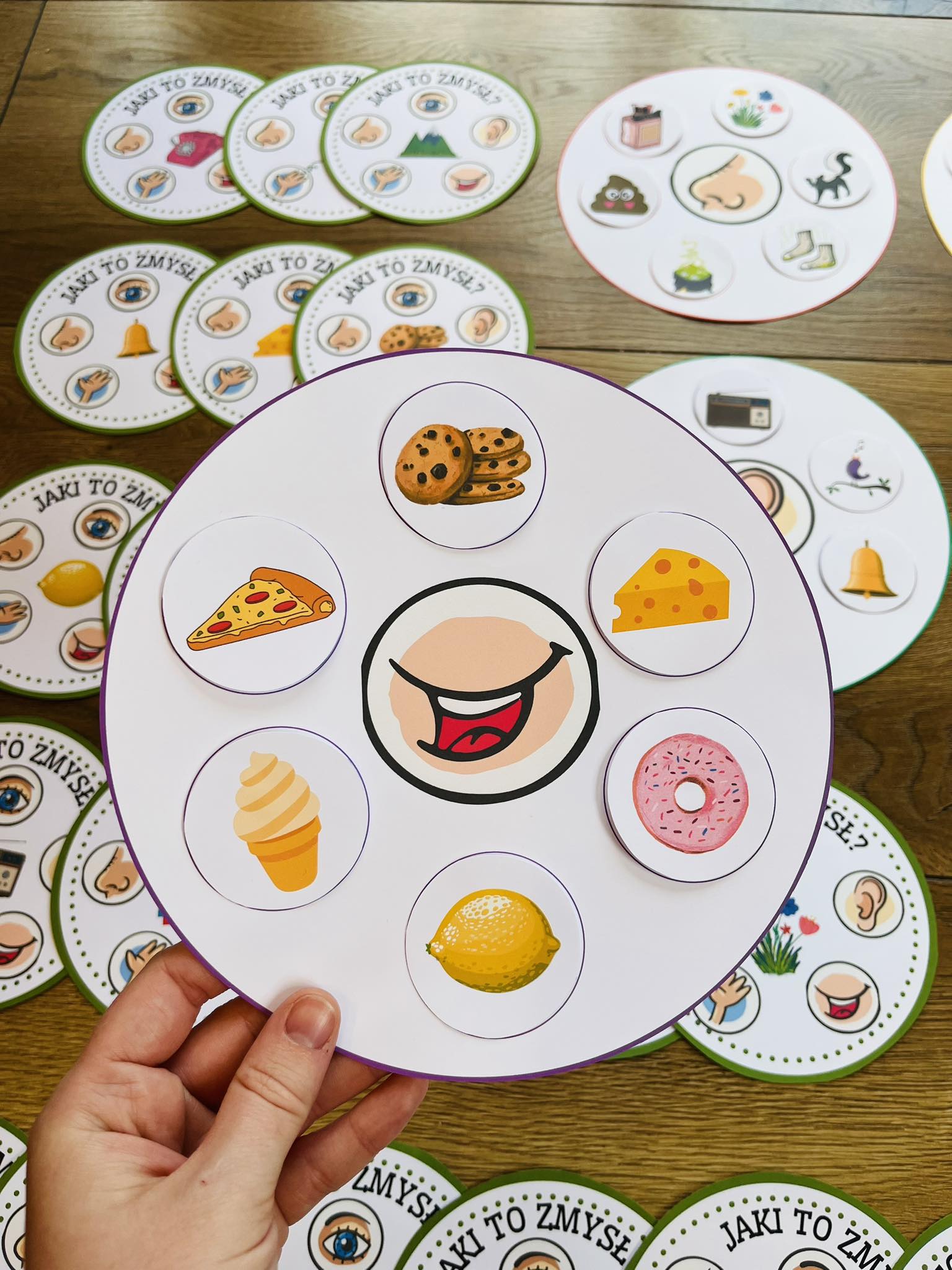 - dopasowanie elementów do odpowiedniego zmysłu - 5 dużych kółek ze zmysłami + małe kółeczka z elementami do dopasowania 21 szt.