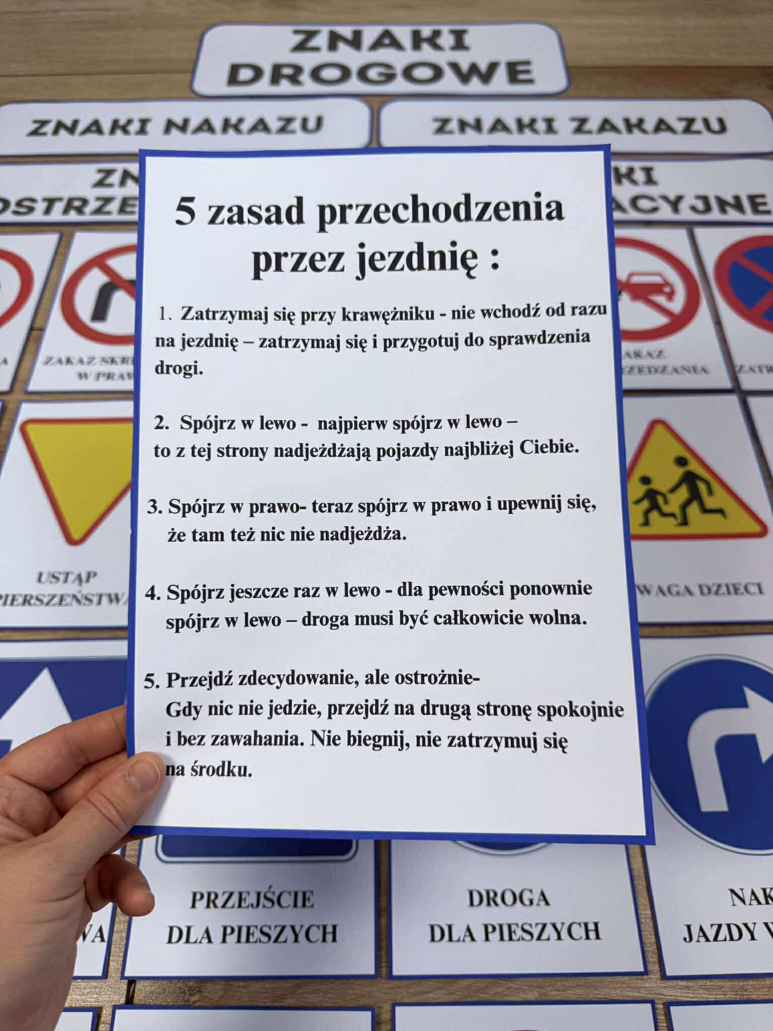Dodatkowo dołączone są zasady przechodzenia przez jezdnie oraz wierszyk, aby ułatwić zapamiętanie tych zasad.