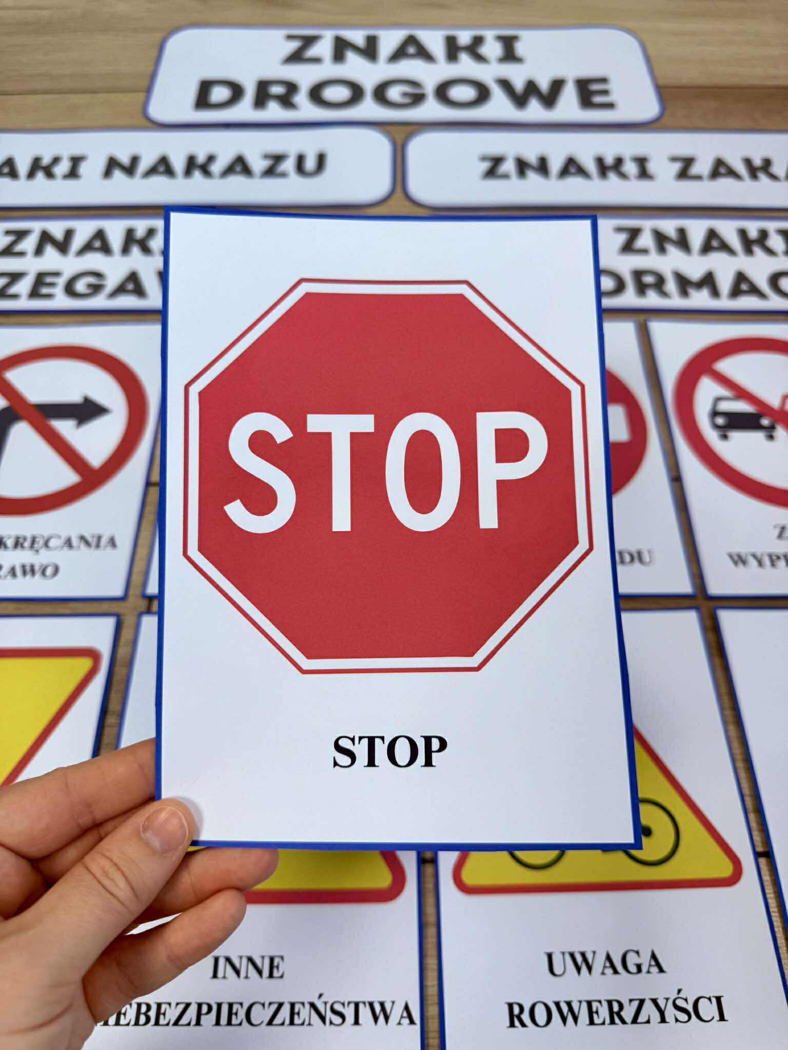 Zestaw składa się z lustracji znaków drogowych. Zawiera również napisy, dzięki którym dzieci mogą samodzielnie dzielić znaki do odpowiednich grup.